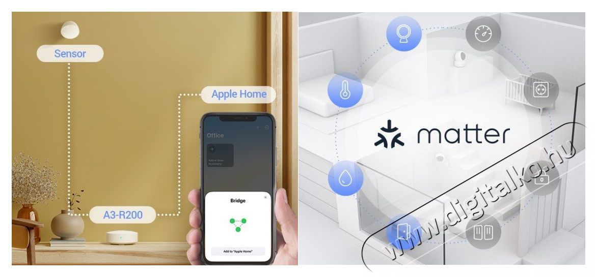 Az EZVIZ A3-R200 központi egység fő jellemzői- Az EZVIZ A3-R200 központi egység kompatibilis a Matter és az Apple HomeKit rendszerekkel