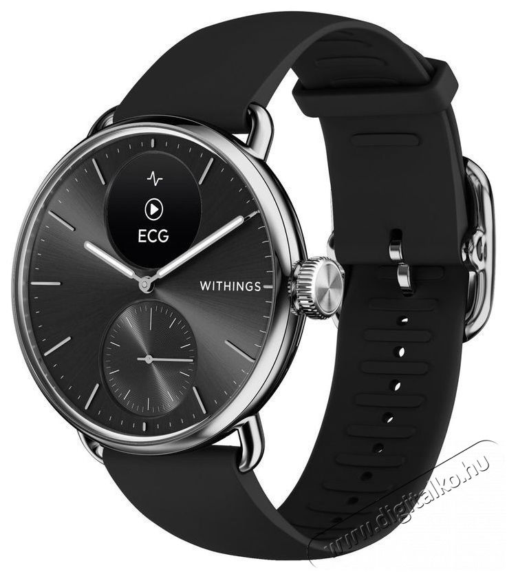 Elegáns hibrid karóra kifinomult egészségmonitorozással A Withings ScanWatch 2 egyesíti a klasszikus órák és a modern okosórák világának legjavát. A precíziósan megmunkált rozsdamentes acél tokot és forgatható koronával ellátott klasszikus kerek kialakítást egy apró, 0,63" átlójú belső kijelző egészíti ki, amely az egészségi állapotra és edzésre vonatkozó legfontosabb adatokat mutatja. A kijelzőt és a számlapot zafírüveg védi. A hibrid órák új generációja új TempTech24/7 modullal és továbbfejlesztett érzékelőkkel büszkélkedhet, amelyek lehetővé teszik a pulzusszám, a vér oxigénellátottság, az EKG és most már a testhőmérséklet pontos mérését is. A Withings ScanWatch 2 okosóra pontosan meghatározza az alvás hosszát, minőségét és fázisait. Az aktív egyének értékelni fogják a beépített sportmódokat a fizikai teljesítmény mérésére. A beépített akkumulátor akár 30 napos üzemidőt biztosít.