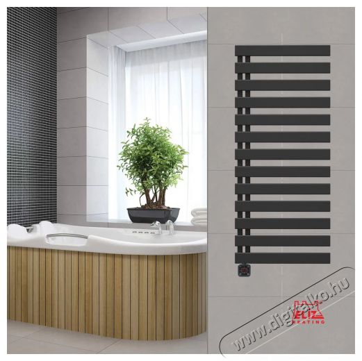 ELÍZ EBR 800 NP-B - Elektromos fürdőszobai radiátor matt fekete színben, 800 W teljesítménnyelAz ELÍZ EBR 800 NP-B elektromos radiátor ötvözi a modern dizájnt a praktikus használattal. Elegáns matt fekete kivitelben készült, és a hangtalan működésnek köszönhetően minden otthonba illik. 800 W-os teljesítményével körülbelül 12 m²-es helyiség fűtésére alkalmas, és praktikus törölközőszárítóként is szolgál. A vezérlés egyszerű – LED kijelzős érintőpanel segítségével. A radiátor megfelel a fűtési energiahatékonysági szabványoknak. Beépített fűtőszállal, 1,2 m-es tápkábellel (230 V) és szerelőkonzolokkal van felszerelve.