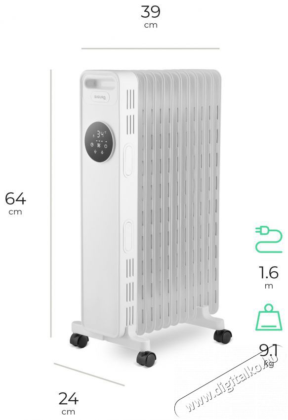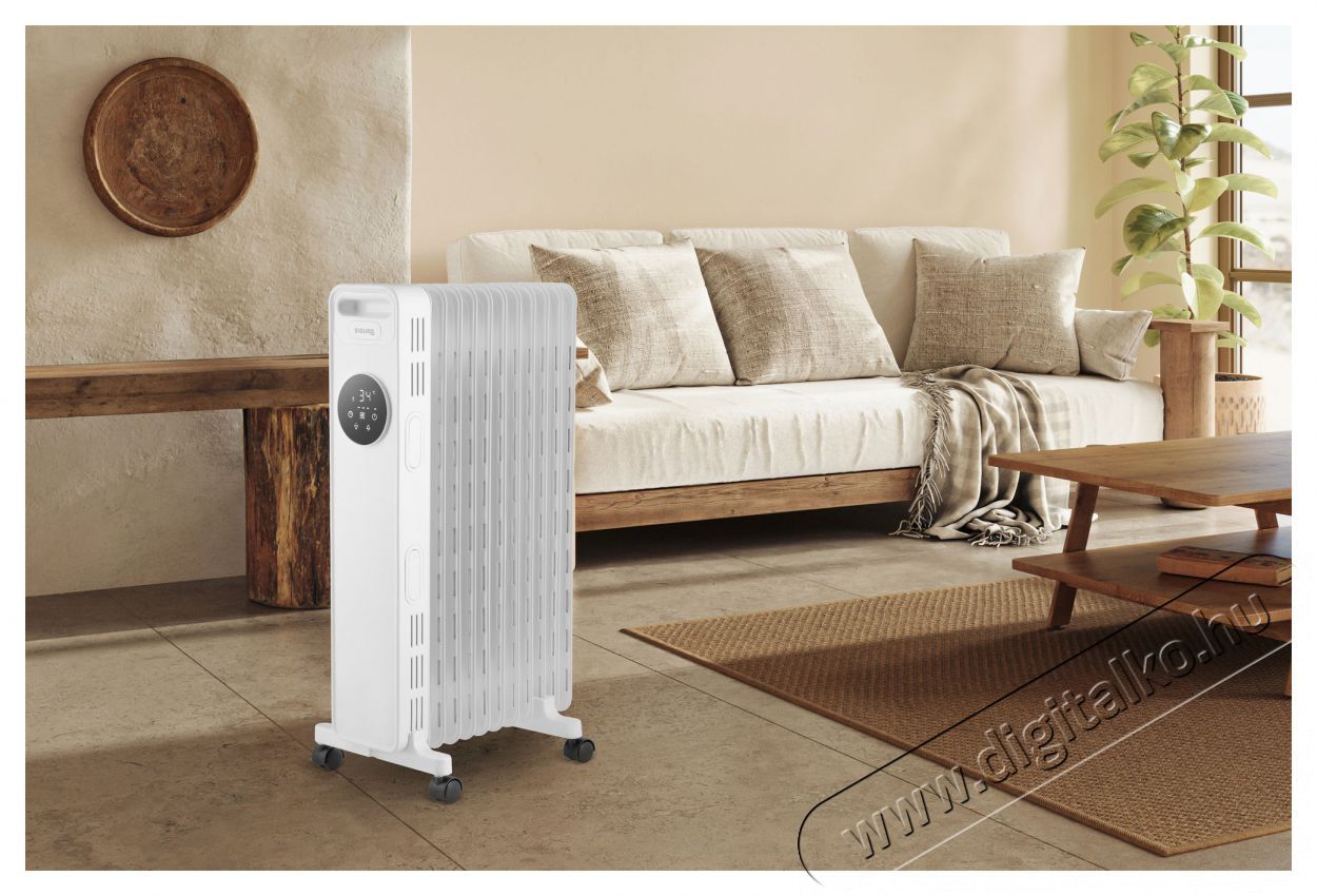 Siguro HO-D511W Dihoplus elektromos radiátor Olyan megoldást keresel, amellyel hatékonyan fűtheted otthonod bármelyik helyiségét, vagy a nyaralót, a műhelyt vagy a garázst? A Siguro HO-D511W Dihoplus elektromos radiátor kettős tanúsítvánnyal rendelkező biztonsági védelemmel és digitális érintőképernyős vezérléssel van ellátva. Csak csatlakoztatni kell a konnektorhoz, és máris élvezheted a meleget. A gyors felmelegedés mellett az olajos tartalmának köszönhetően a radiátor hosszú ideig megtartja a hőt kikapcsolás után is. A görgők lehetővé teszik a készülék könnyű áthelyezését a különböző helyiségek között, így mindig ott használhatod, ahol éppen szükséged van rá. A radiátor fogyasztása 2300 W, a fűtési teljesítmény három fokozatban állítható, időzítővel rendelkezik a be- és kikapcsoláshoz, valamint távirányítóval. A Siguro HO-D511W Dihoplus akár 20 m2-es helyiségek fűtésére alkalmas.