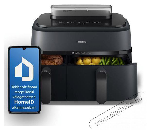 Fedezze fel a dupla kosaras Airfryer készüléket a HomeID alkalmazás személyre szabott receptjei segítségével. Élvezze a lépésenkénti útmutatást, és férjen hozzá több száz ízletes ételhez az Airfryer készülékhez szabott beállítások révén.