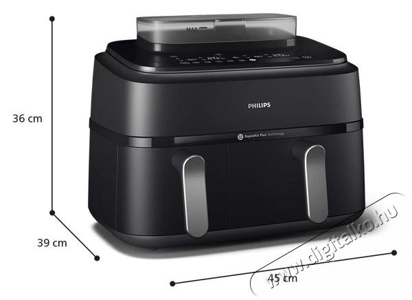 9 literes Airfryer 2 kosárral és párolás funkcióval: a 6 literes fiók a főételekhez, hasábburgonyához és kedvencekhez, a 3 literes fiók pedig a köretekhez és a rágcsálnivalókhoz. Akár 1100 g hasábburgonya, 1600 g zöldség vagy 12 csirkecomb is elfér benne. A nagy kosárban egy egész, 1,2 kg-os csirkének is van hely.