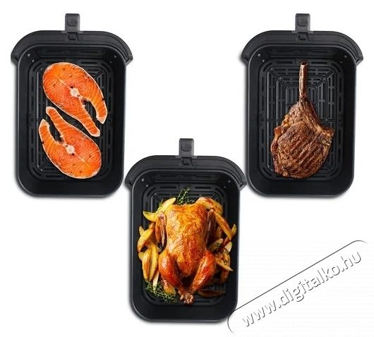 A forrólevegős fritőz 1700 W teljesítményével a levegő gyorsan felmelegszik és optimális üzemi körülmények uralkodnak a teljes használat során. A hőmérsékletet és a sütési időt külön-külön is beprogramozhatod, vagy választhatsz 7 program közül. A csomagban a fritőz mellett található kivehető edény és csirkesütő rács.