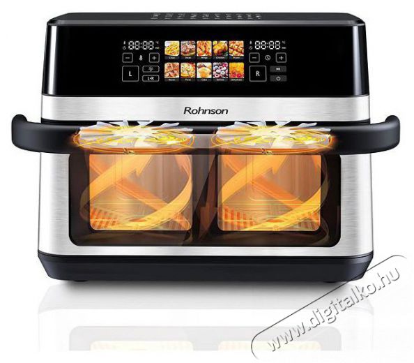 Ezen Rohnson meleglevegős fritőz felszereltsége és funkciói megkönnyítik használatát. Az időzítő segítségével időkorlátot programozhatsz be bizonyos ételek elkészítéséhez. A hőmérséklet szabályozás funkció lehetővé teszi a kívánt hőmérséklet beállítását az étel típusa alapján, amelyet aztán a fritőz a működés során fenntart. A kettős sütés funkció abban az esetben jön jól, ha különféle ételeket kell egyszerre készítened, amelyekhez külön kell beállítani a hőmérsékletet vagy a sütési időt. Például a fritőz egyik oldalán chipset, a másik oldalán pedig halat süthetsz. Az automatikus programok szerepe, hogy ne kelljen az idő és hőmérséklet beállításokkal kísérletezned a leggyakoribb ételeknél. A szárítás funkció segítségével élelmiszereket is száríthatsz, mint például húsféléket, zöldégféléket, gyümölcsöket, gombát, vagy akár halat.
