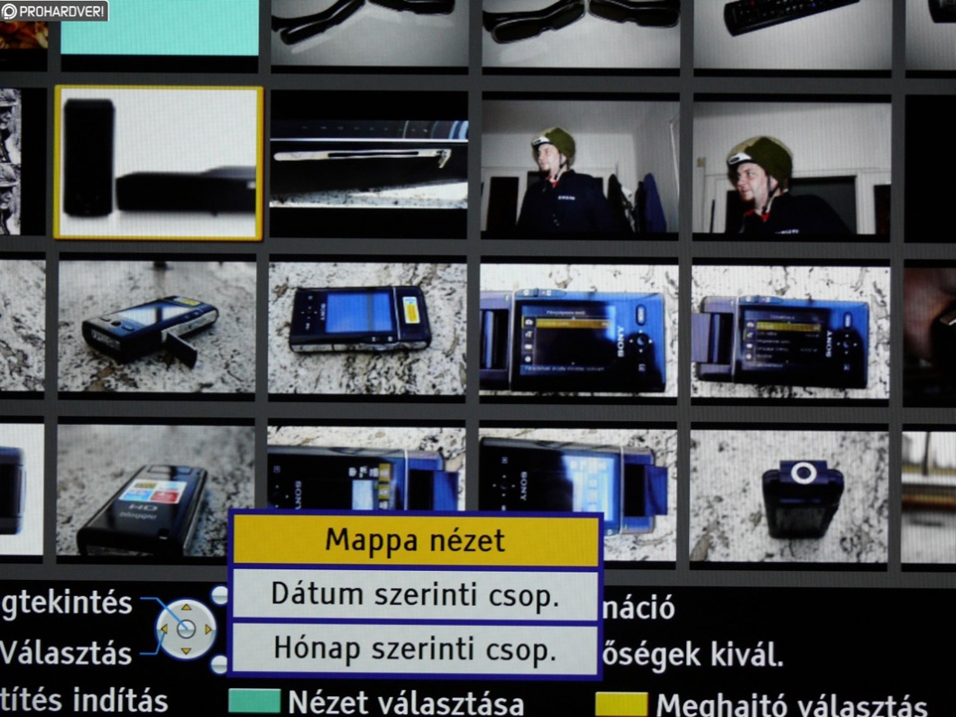 Gyakorlatilag egy teljes értékű digitális fótóalbumot applikáltak ebbe a tévébe. Kérhető keret a képek köré, megnézhetőek fekete-fehérben, illetve szépia módban, és kijelölhető, hogy diavetítés esetén milyen effekt mellett történjen meg a váltás. Lehetőség nyílik nagyításra, módosítható a képváltás ideje, aktiválható az újrajátszás, és külön háttérzene is kérhető. Három beépített melódiát tartalmaz a készülék, ám ha valaki úgy gondolja, saját ízlésének megfelelő dallal is fokozhatja az élvezeteket. Saját lejátszási lista is összeállítható, az I gomb megnyomásával pedig infókat kapunk a fájl nevéről, elkészítésének idejéről, illetve a felbontásról. A kisméretű, előzetes képek jól mutatnak, és csak azokat a könyvtárakat mutatja az eszköz, amelyekben megtalálható a támogatott formátum. Itt el is érkeztünk az egyetlen gyenge ponthoz: csak a JPG képek megjelenítése jöhet szóba, tehát a PNG, BMP, TIFF, GIF, pláne animgif mind felejtős.