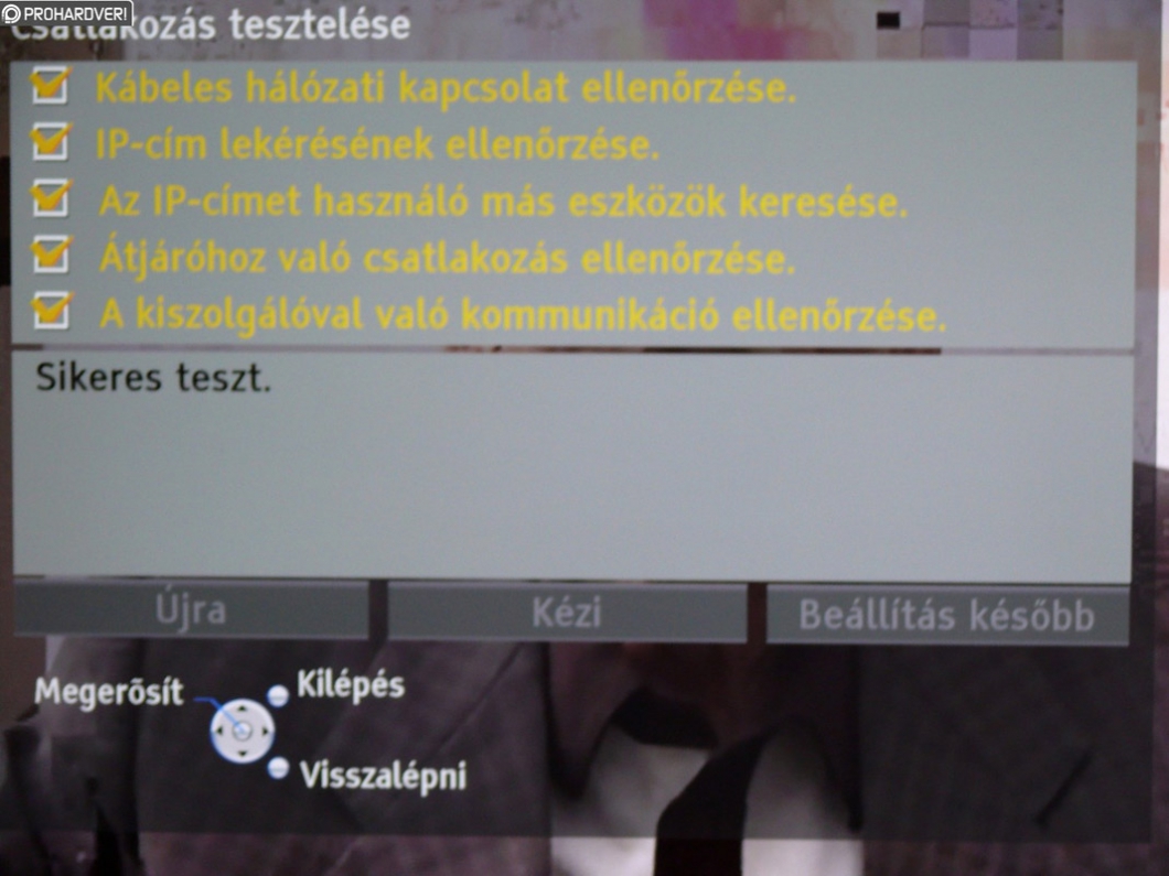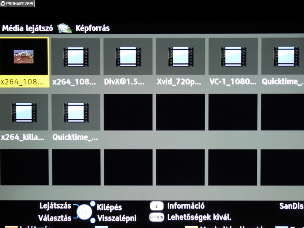 Természetesen a Prohardver teszteknél már megszokott tesztanyagot dobtuk oda a tévének. Sajnos ez a funkció sem tökéletes, hiszen a HD TV (BDAV_1080p@8Mbps.m2ts), illetve H.264 (TS) (MPEG_1080i@6.5Mbps.ts) fájlokat fel sem ismerte, a 9,7 Mbps bitrátájú MKV fájl lejátszását pedig egész egyszerűen megtagadta. A Windows Media Videónál csak a hanggal akadtak gondjai, és ugyanez volt a bibi a két QuickTime fájllal. Az nem igazán lepett meg minket, hogy a Killa_sample bolondot csinált belőle, de legalább felismerte és elindult, igaz, egy másodperc után le is állt. A maradék, tehát a DivX, az XviD, illetve a 3,8 Mbps MKV rendben volt, csak ez egy picit kevés. Abban azért lehet bízni, hogy a szoftverfrissítések orvosolják ezt a problémát.