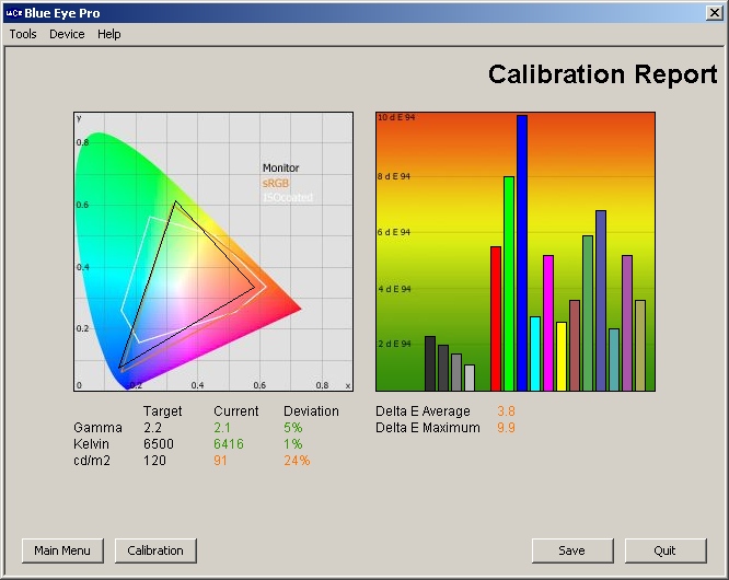 Itt pedig következzenek az általunk, illetve a kalibrátor által ideálisnak vélt értékek. Mint a mellékelt képből is látszik, nem sikerült túl jól a kalibrálás, pedig jó sok időt és energiát beletettünk az legjobb beállítások megtalálásába. Érdekes, hogy a fehéregyensúllyal és a gammával kapcsolatos paramétereket csak akkor lehet elérni, ha PC üzemmódra van állítva a modell.