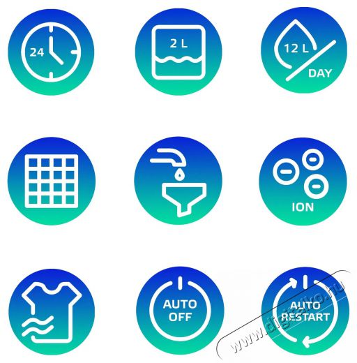 | Funkció | "Turbo" rendszer ruhák szárításához, Anti-Freeze, Automatikus kikapcsolás, Automatikus párátlanítás, Érintőpanel, Időzítő, Kijelző, Megtelt tartály jelző, Teljesítmény szabályozás |