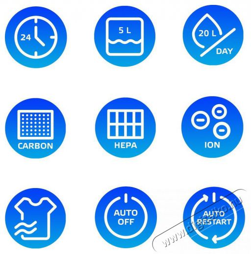 | Funkció | "Turbo" rendszer ruhák szárításához, Anti-Freeze, Automatikus kikapcsolás, Érintőpanel, Időzítő, Kijelző, Megtelt tartály jelző, Teljesítmény szabályozás |