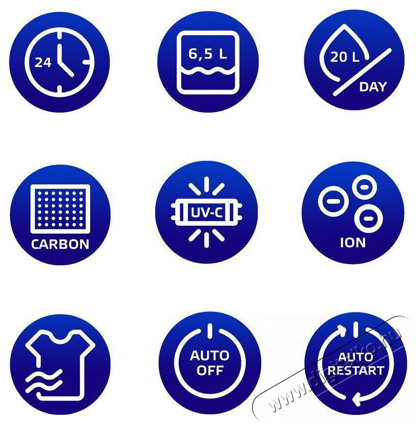 | Funkció | "Turbo" rendszer ruhák szárításához, Anti-Freeze, Automatikus kikapcsolás, Automatikus párátlanítás, Érintőpanel, Időzítő, Kijelző, Megtelt tartály jelző, Teljesítmény szabályozás |