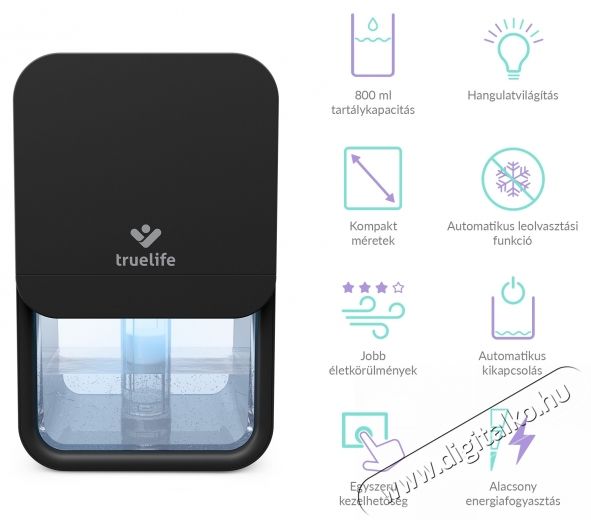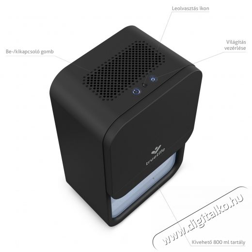 Páramentesítő otthonra és irodába, csendes, kompakt méretek, nagy tartály (800 ml), alacsony fogyasztás, TrueLife FrostGuard technológia, automatikus kikapcsolás funkció, könnyen használható, hangulatvilágítás. Fekete színben. Tartozék: 1db AC/DC adapter.