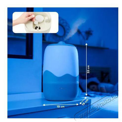 Párásító gyerekszobába - gyerekeknek, 3 az 1-ben, párásítóként, diffúzorként és éjszakai fényként működik, 360°-ban állítható fúvóka, 4 l kapacitás, 26 órás működés, 3 gombos vezérlés, időzítő, halk működés, automatikus kikapcsolás, legfeljebb 67,5 m²-es helyiségbe.