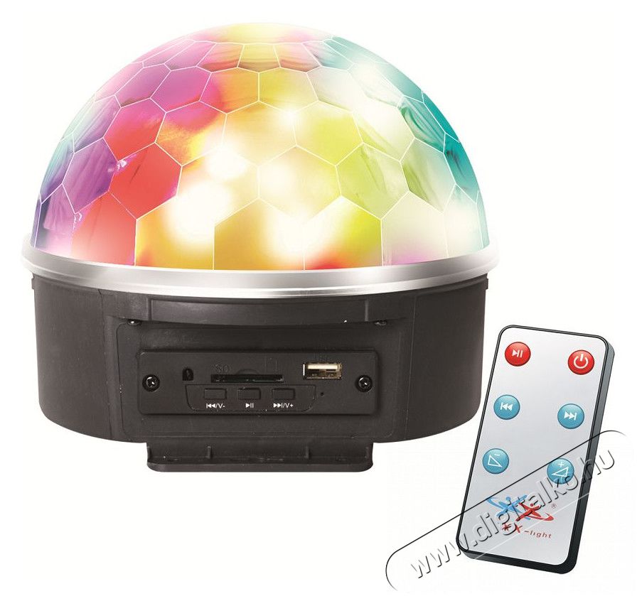 Folyamatosan változó színek és ábrák kivetítése, ideális nagyobb helyiségekbe is (kb.100m2), beépített mikrofonjával követi a zene ritmusát. Sztereó zenelejátszó két beépített hangszóróval, távirányítóval.