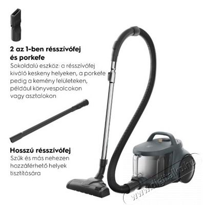 A praktikus használatra tervezett porszívó portartálya 2 literes, az eszköz kompakt mérete megkönnyíti a tárolását, a ciklonleválasztó pedig gondoskodik az eltömődéstől mentes teljesítményről. A HEPA szűrés és a CombiFloor szívófej biztosítja az alapos tisztítást többféle felületen.