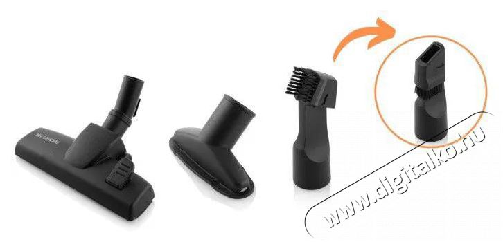 - Felszerelések és tartozékok: Padló-, kárpit-, réstisztító szívófej, puha sörtéjű kefe