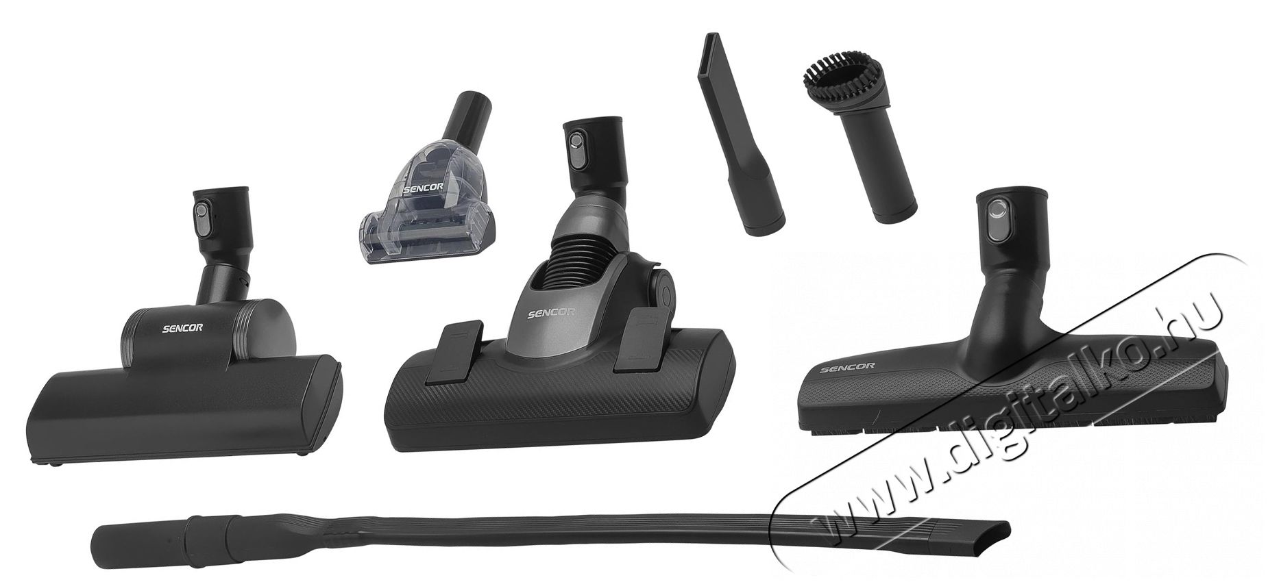 Mellékelt tartozékok: univerzális padlószívó fej, turbókefe, mini turbókefe, szívófej kemény padlókhoz, hosszú hajlékony résszívó fej, kefés szívófej, résszívó fej