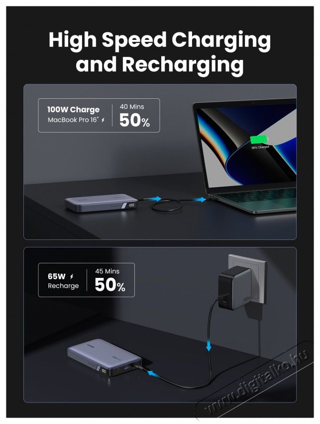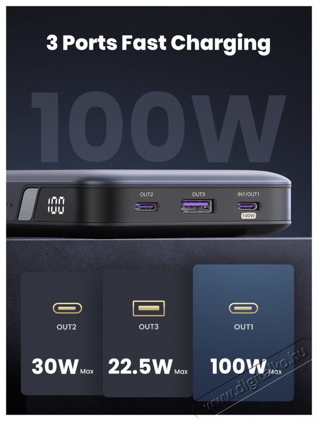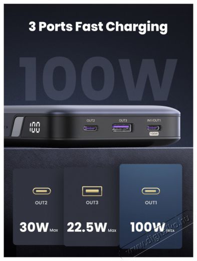 A UGREEN powerbank támogatja a 100W-os gyors PD töltést USB-C porttal és 22,5W-os USB-A csatlakozóval. . A Ugreen powerbank maximális teljesítménye 100 W, és a portok egyidejűleg használhatók.