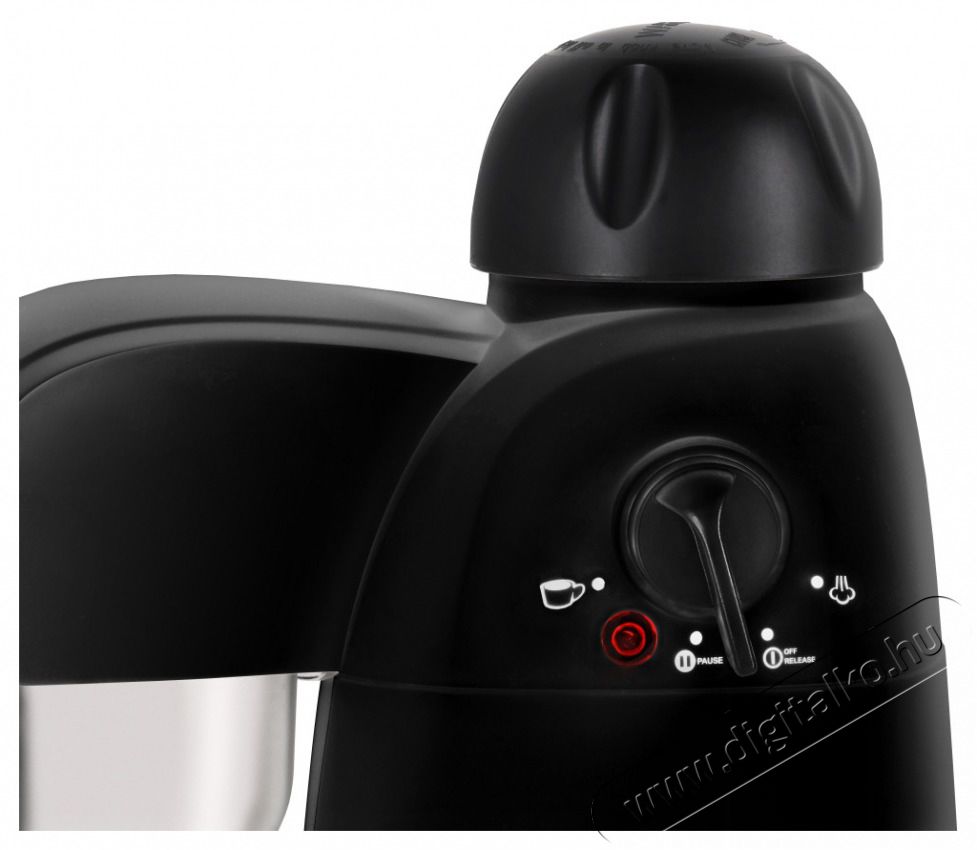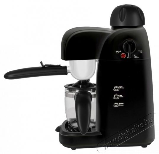 Elektromos típusú fekete kávéfőző kijelző nélkül; kávébab tartállyal nem rendelkezik.Víztartály kapacitása 0.24 l. Teljesítmény 800 W. Tejhabosító van, teafőző funkció nincs. Csésze előmelegítő funkció nincs, daráló nincs.