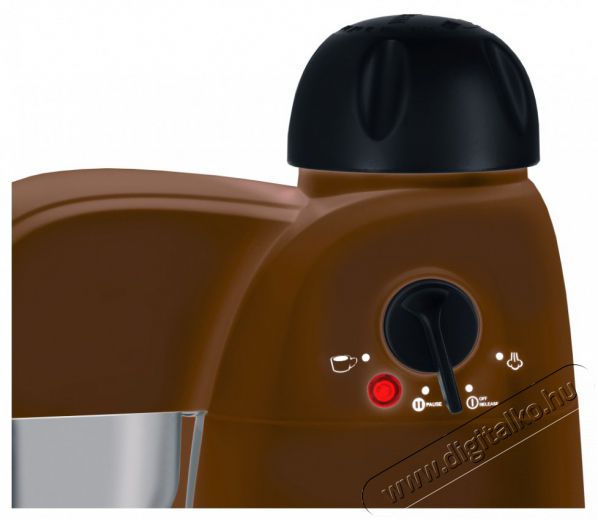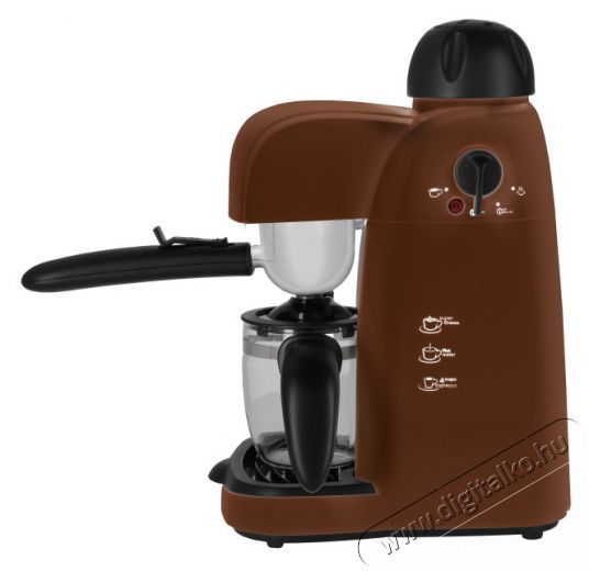 Elektromos típusú barna kávéfőző; 800W-os teljesítménnyel. Tejhabosítóval rendelkezik. Kijelzője nincs, gőznyomás: 5 bar.
