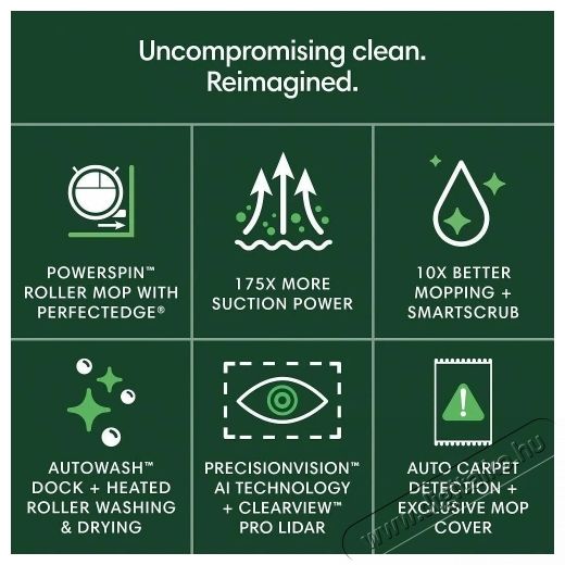 | Funkció | Automata feltöltés, Automata kiürítés, Felmosó mop automatikus tisztítása, Időzíthető takarítás, Lépcsőről való leesés elleni érzékelő, Padlófelszínhez való alkalmazkodás, Szennyeződés felismerés, Takarítandó helyiség meghatározása, Takarítás folytatása újratöltés esetén, Több helyiségbeni porszívózás, Ütközésérzékelő |
