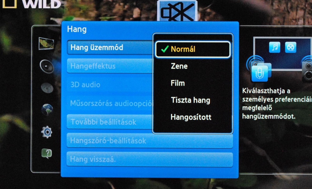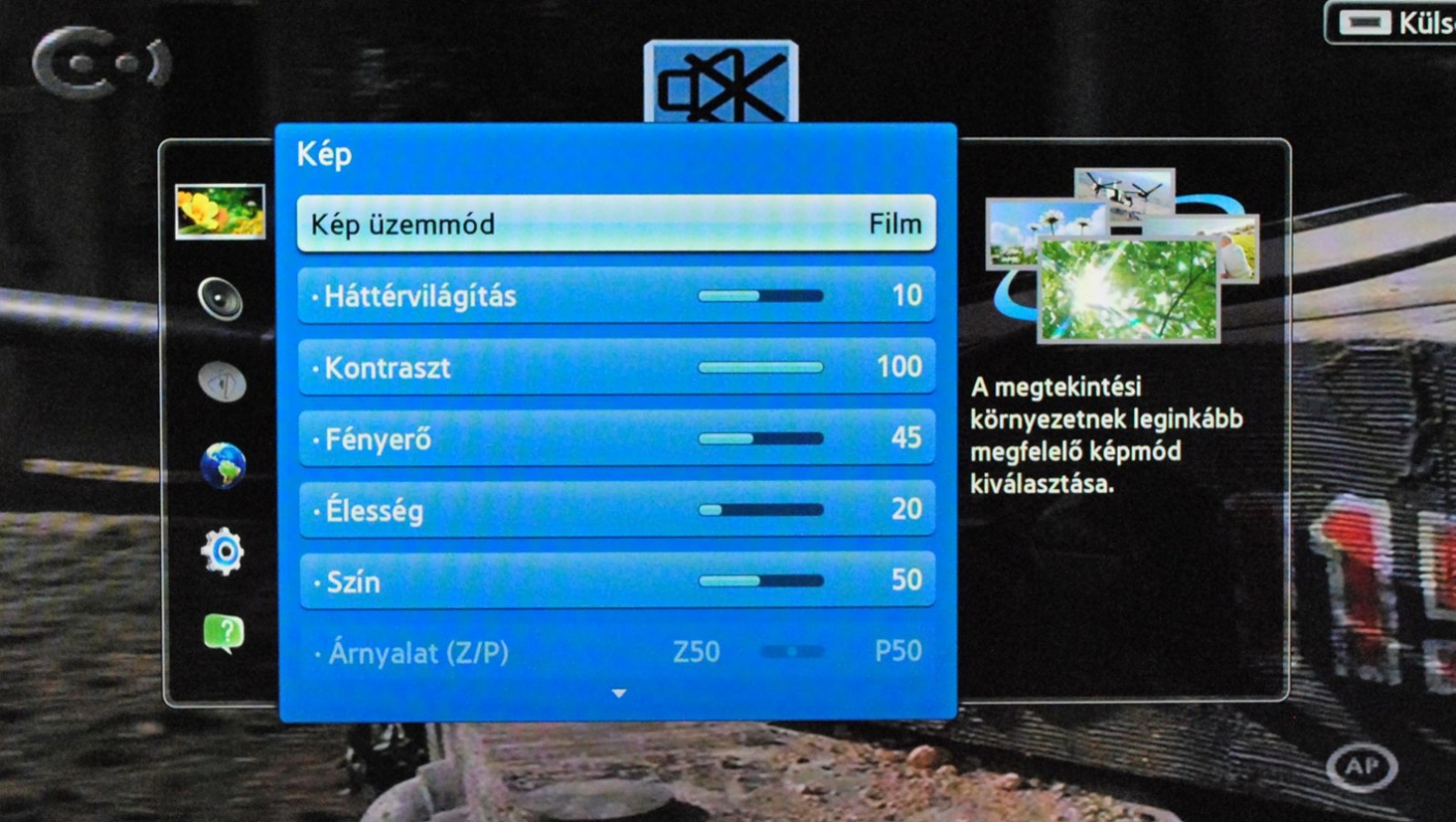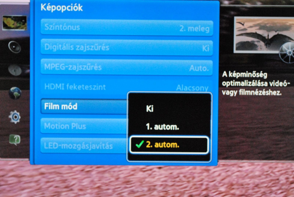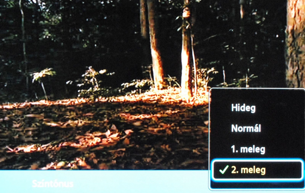 A Samsung korábbi tévéire jellemző volt, hogy nem kínáltak túl nagy választékot az előzetesen beprogamozott profilok terén, és ezen sajnos most sem változtattak. Ennél is nagyobb baj, hogy a négy opció közül egyedül a Film tűnik használhatónak. A korábban remekül teljesítő Természetes opció is érthetetlenül világos lett, a Kiemelthez hasonlóan. Sajnos ezek analóg, kisfelbontású tartalmak esetén használhatatlanok, mert borzasztóan zajos lesz a kép. A Normál sem az igazi, mert ott meg szürke fátyol telepszik a képre, amin azért a fényerő csökkentésével lehet valamelyest segíteni.