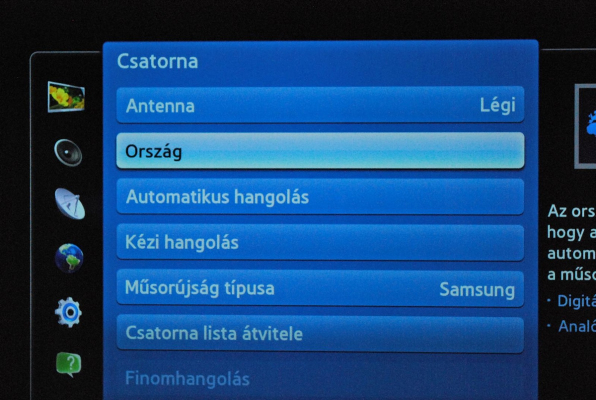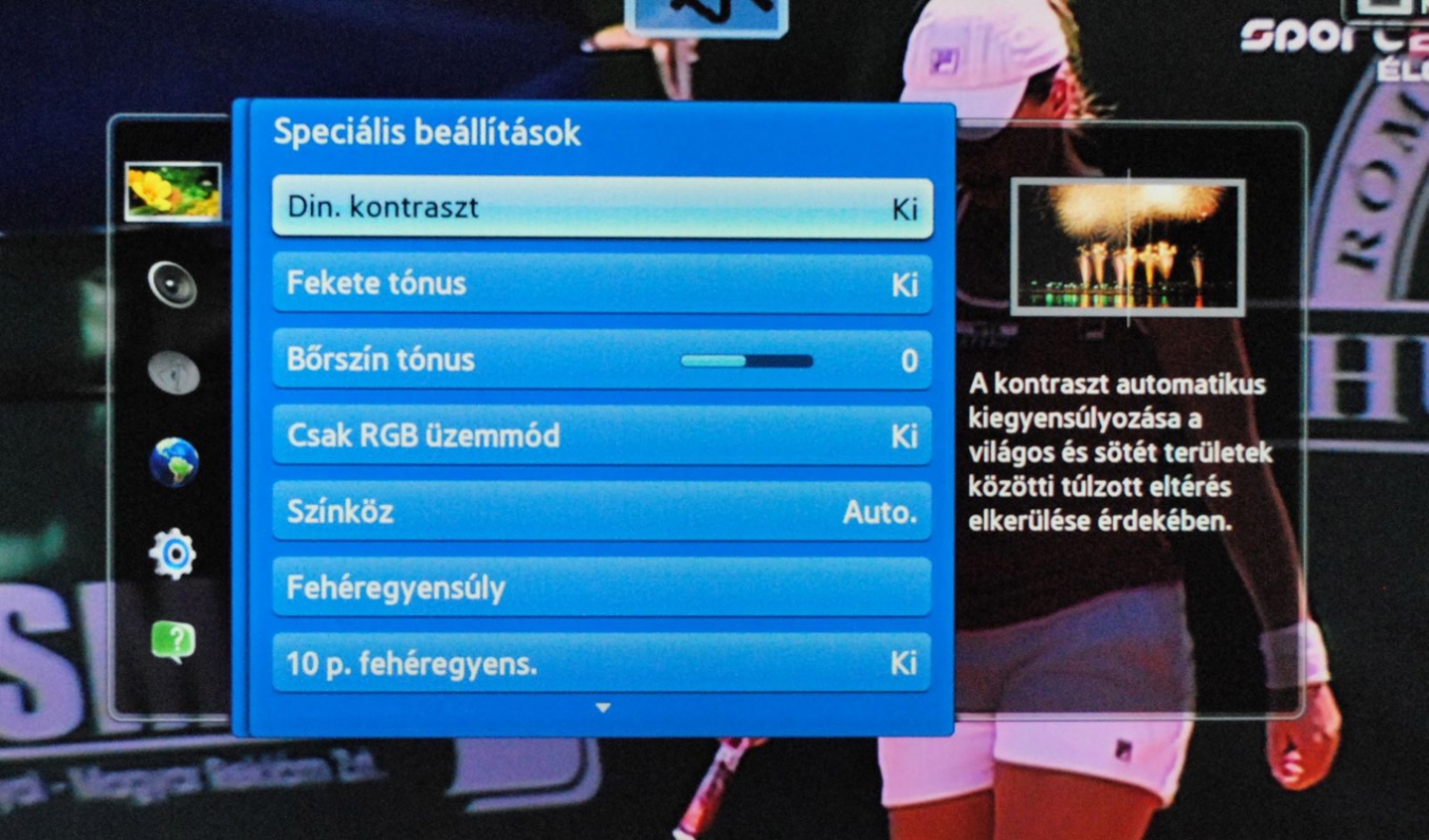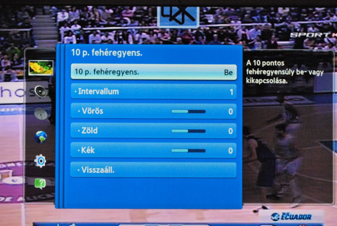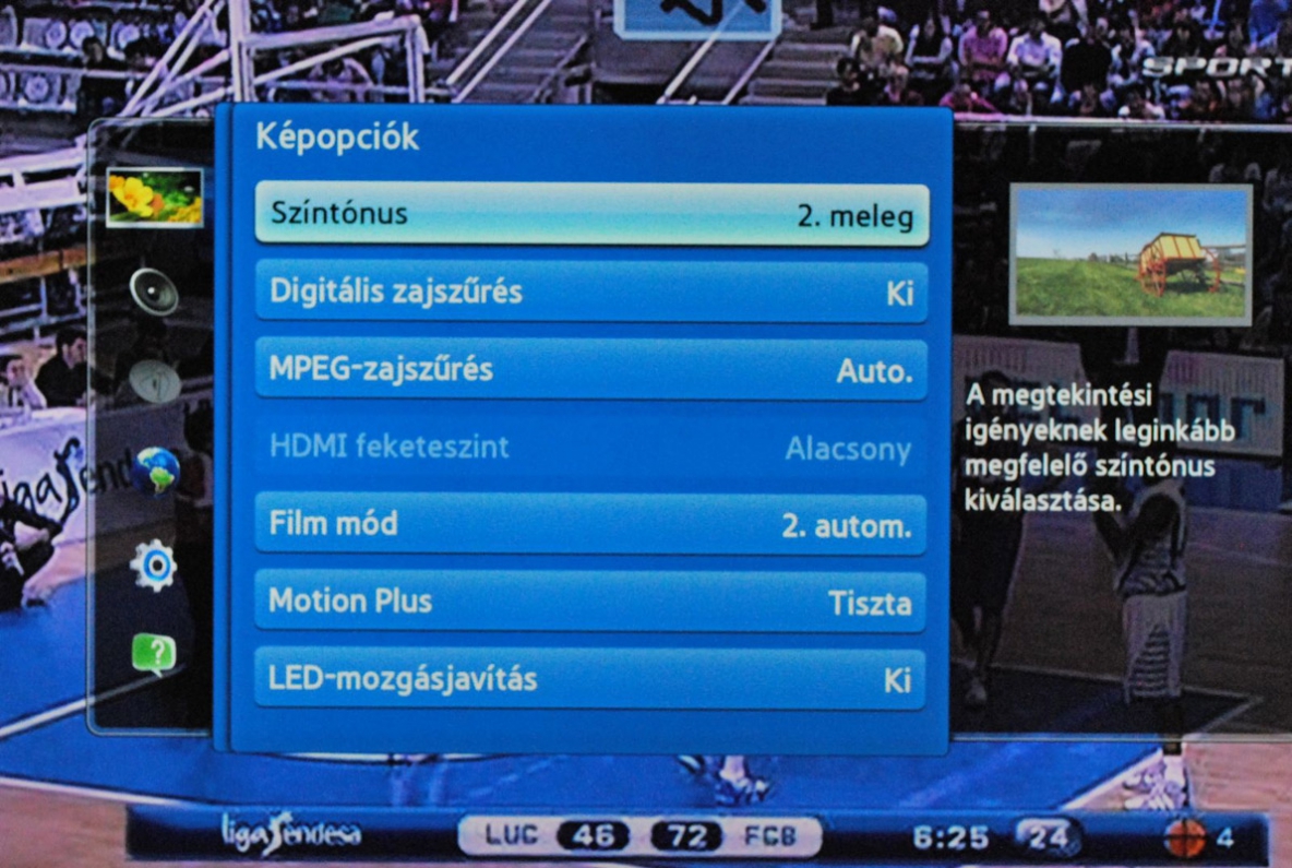 A Samsung korábbi tévéire jellemző volt, hogy nem kínáltak túl nagy választékot az előzetesen beprogamozott profilok terén, és ezen sajnos most sem változtattak. Ennél is nagyobb baj, hogy a négy opció közül egyedül a Film tűnik használhatónak. A korábban remekül teljesítő Természetes opció is érthetetlenül világos lett, a Kiemelthez hasonlóan. Sajnos ezek analóg, kisfelbontású tartalmak esetén használhatatlanok, mert borzasztóan zajos lesz a kép. A Normál sem az igazi, mert ott meg szürke fátyol telepszik a képre, amin azért a fényerő csökkentésével lehet valamelyest segíteni.