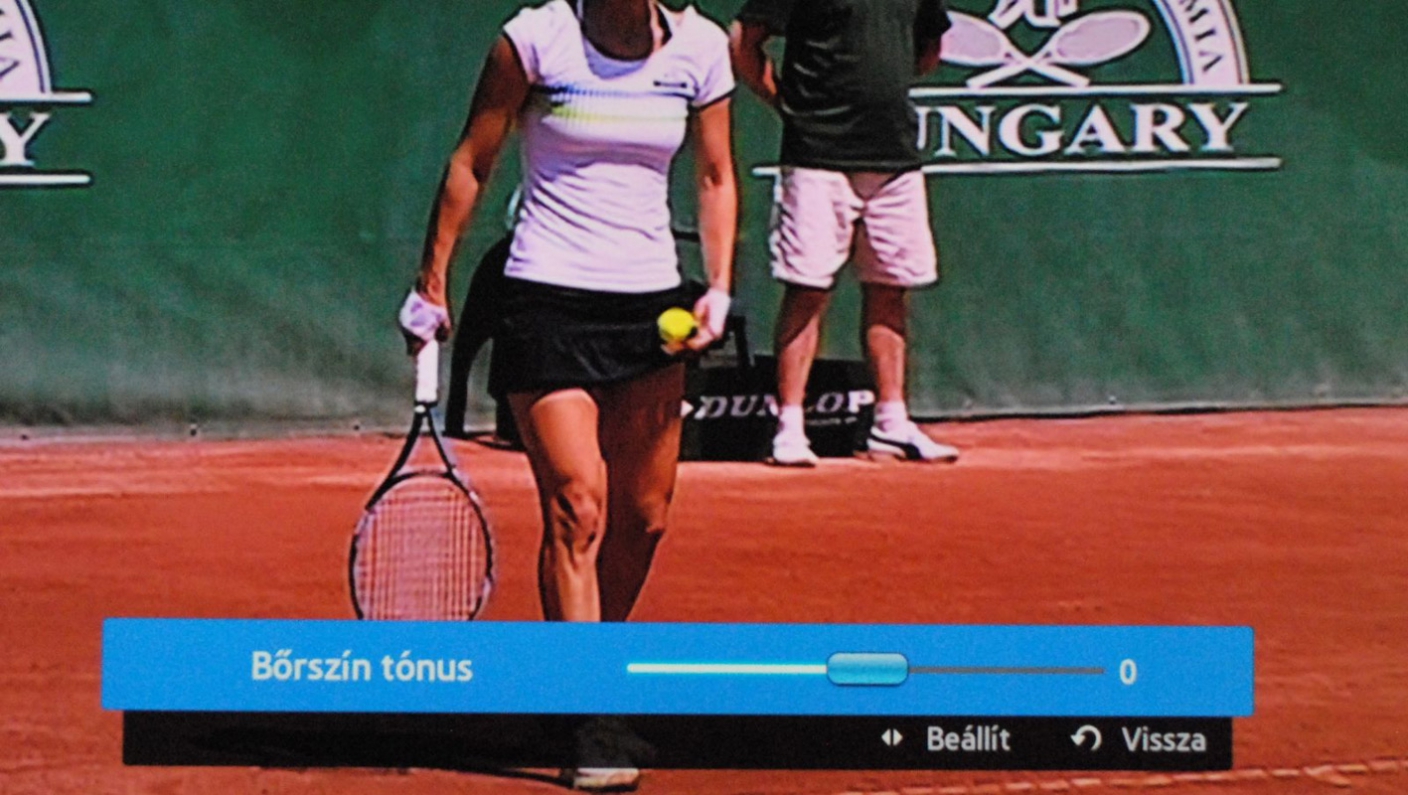 Bőrszín tónus: Ez régi Samsung találmány már. Egy harminc fokozatból álló skála segítségével kenhetünk pirosítót a képernyőn felbukkanó sápatag arcokra. Ha valami bibi akadna a bőr megjelenítésével, akkor érdemes elbabrálni vele.