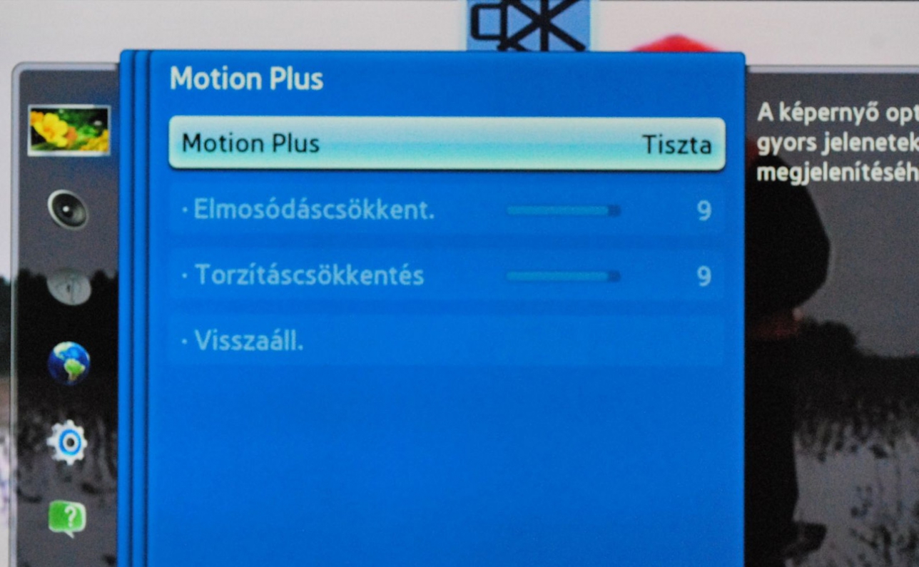 Motion Flow: Erről már esett szó korábban, arról viszont nem, hogy három előre beprogramozott opció közül lehet választani, illetve helyet kapott a kínálatban egy Egyéni profil is. Itt mód nyílik az elmosódás, illetve a torzítás csökkentésének egy tízfokozatú skálán történő beállítására. Ezzel érdemes óvatosan bánni, mert túlságosan agresszívre állítva hajlamos furcsaságokat művelni a kép, érthetetlenül belassul vagy felgyorsul olyakor egy-egy pillanatra.