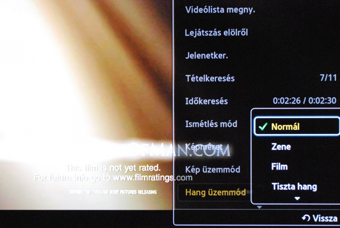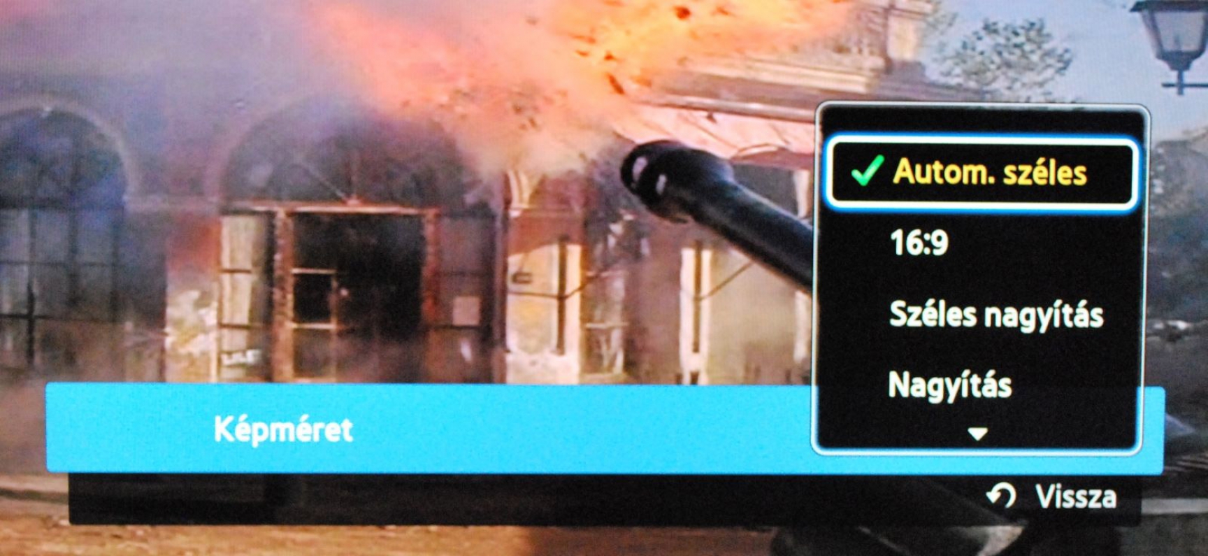 A képaránnyal nem vacakoltak sokat. A 16:9 mellett elérhető a 4:3 és két nagyított opció is. De talán a legjobb egyszerűen Automatán hagyni, ugyanis az elektronika remekül végzi a dolgát, és mindig tökéletesen, a lehető legkevesebb torzítással tölti ki a képet.