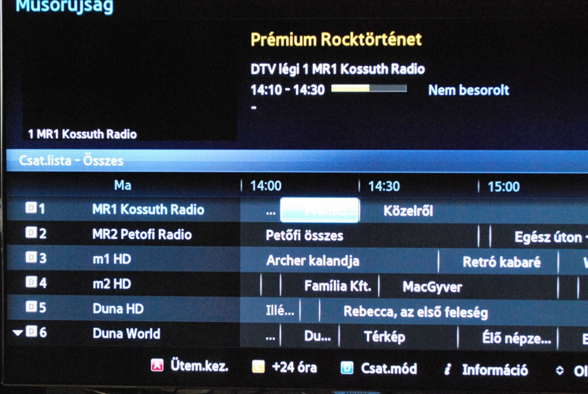 Digitális adások esetén az Info gomb megnyomása után a képernyő felső részén rövid leírás jelenik meg az adott műsorról. Ez egyébként az Elektronikus Programmagazinból is elérhető, amibe a Smart TV rendszeren vagy a Guide gomb megnyomásán keresztül vezet az út. Az EPG felépítése logikus, a bal felső sarokban látszik az éppen futó tévéadás, mellette egy rövid leírás, alatta pedig maga a tévéújság.Egyszerre hat adó egyenként négy műsora fér ki a képernyőre, ami ma már kicsit kevés. Egy adott programra kattintva aktiválható a külső tárolóra történő időzített felvétel, vagy beállítható, hogy a megadott időpontban automatikusan kapcsoljon oda a készülék. Sajnos a programok típusuk (sport, hírek, film stb.) szerint nem rendezhetőek csoportba, pedig az egy kifejezetten hasznos szolgáltatás lenne.