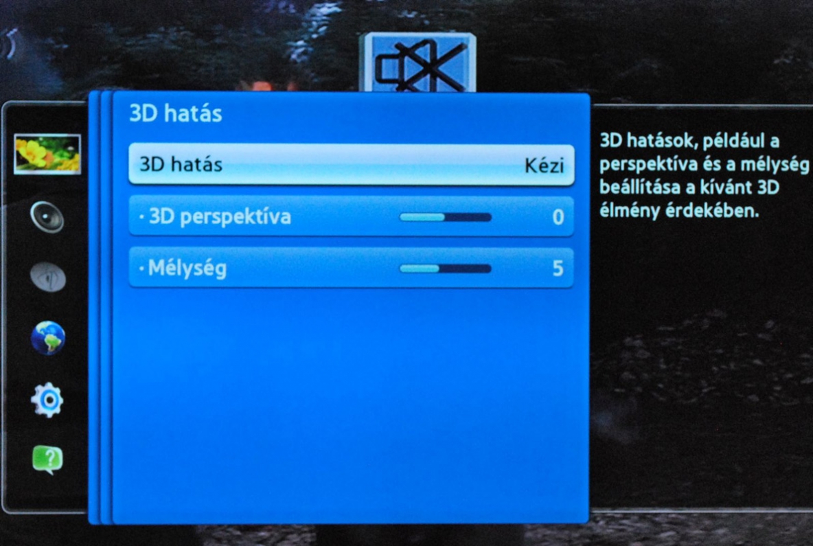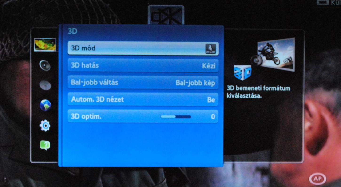 A modell az összes létező háromdimenziós szabványt támogatja, és amennyiben ilyen tartalmat észlel, automatikusan 3D nézetre vált. Ez persze később igény szerint ki- és bekapcsolható a 3D gomb megnyomásával, az egyéb beállítások pedig a főmenüből érhetőek el. A 3D Perspektíva funkció a térhatás agresszivítását szabályozza egy tízfokozatú skálán, a 3D Mélységgel pedig ezen lehet még tovább finomítani. 2D-3D konverzió esetén érdemes a perspektívával finoman bánni, mert a szellemképesedés erőteljesen jelentkezhet. A termékkommunikációban hangsúlyozták, hogy tovább javítottak a konvertáló algoritmuson, de mi nagy különbséget nem érzünk a tavalyi modellekkel összehasonlítva.