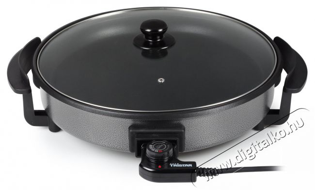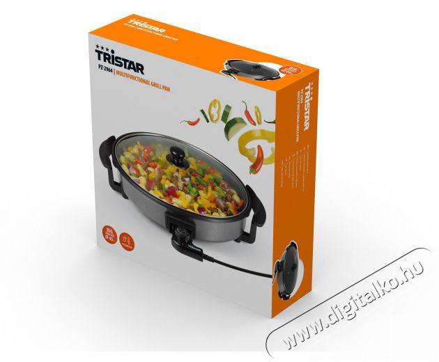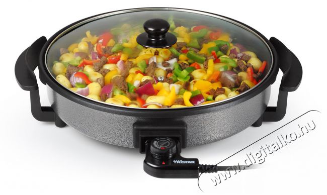 A PZ-2964 multifunkcionális, elektromos serpenyő prémium minőségű és robosztus fémből készült, amelyet a TRISTAR tapadásmentes teflon bevonattal látott el. A 40 cm átmérőjű serpenyő másik nagyszerű előnye a felcsatlakoztatható termosztát, amely zökkenőmentes hőmérsékletszabályozást biztosít a PZ-2964 belsejében. A masszív üvegfedőnek köszönhetően mindig láthatod, hogy mi történik a serpenyőben. A fedő gőzszeleppel is el lett látva, amely kivezeti a felesleges párát a serpenyő belsejéből. A TRISTAR PZ-2964 elektromos serpenyő kiválóan alkalmas főzéshez, sütéshez, pároláshoz, pörköléshez és pirításhoz.