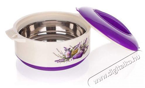 BANQUET Culinaria LEVENDER A03164A Banquet praktikus, 2,5 literes, fedővel ellátott thermo edénye rekord ideig melegen tartja az ételt. Ez a tulajdonság különösen jól jöhet, ha az elkészült ételt nem azonnal szeretnéd felszolgálni. A belső rozsdamentes acélból készült edény és a külső burkolat között poliuretán hab található, amely kiváló hőszigetelő, így tárolás és szállítás közben melegen tartja az ételt. Ez a praktikus edény levendula mintás kivitelben készült, így stílusos kiegészítője lesz a konyhádnak.