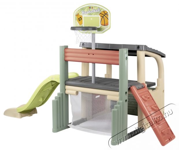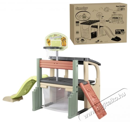 Smoby játszótér, SzórakoztatóközpontA 62%-ban újrahasznosított műanyagból készült Smoby Life szórakoztatóközpont számos játék- és sportlehetőséget kínál. A fedett játszóház félig nyitott bejárattal rengeteg helyet kínál barátok és testvérek meghívására. A sokoldalú sportpálya a Vidámparkot kedvelt hellyé teszi, akár a kertben, akár a gyerekszobában. A gyerekek rengeteg szórakozást fognak tapasztalni a stabil, színes csúszdával, a hálós focikapuval és a kosárpalánkkal. A mászófal forgatható és létraként használható. A csúszda hossza 150 cm, és egy széles csúszdakijáratban végződik, amely biztosítja a puha landolást. Különleges élmény a forró nyári napokon: a csúszda könnyen vízicsúszdává alakítható. Egyszerűen csatlakoztass egy hagyományos kerti tömlőt (nem tartozék) a csúszda aljához, és máris kezdődhet a vízi móka! A Smoby szórakoztató központ kiváló minőségű, UV-álló műanyagból készült, így különösen ellenálló az időjárás viszontagságaival és a fakulással szemben. A speciális gyártási eljárás kiváló ellenálló képességet és hosszú élettartamot garantál.