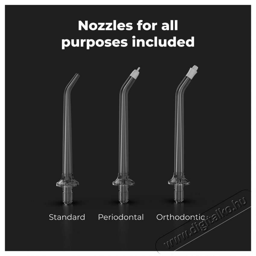 Az AENO DI2 elektromos szájzuhany 3 fúvókával érkezik a fogak és az íny átfogó ápolásához - ortodontális, parodontális és standard. A normál fúvókát a normál napi higiéniához használhatod, a parodontális fúvóka az ínyedre vigyáz, az ortodontális fúvókát pedig a fogszabályozót viselők fogják értékelni.