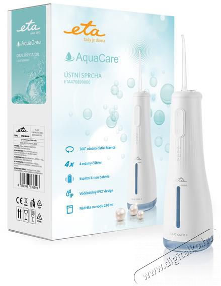 ETA470890000 - Szájzuhany ETA AquaCare II 4708 90000Orális zuhany a fogközök gyengéd tisztításához 4 tisztítási móddal. Időtartam akár 50 perc, vízállóság IPX7. A fogászati higiénia területén is a megelőzés az alap. Az ETA AquaCare II szájzuhannyal új tisztaságérzetet fog tapasztalni, és mosollyal az arcán távozik a fogorvostól. Az ETA AquaCare II szájzuhany nagyon hatékony, de gyengéd rendszert kínál a teljes fogazat tisztítására. Az erős és koncentrált víznyomásnak köszönhetően nemcsak a lepedéket és szennyeződéseket, hanem a problémás baktériumokat is eltávolítja a fogak közötti helyekről és az íny alól.