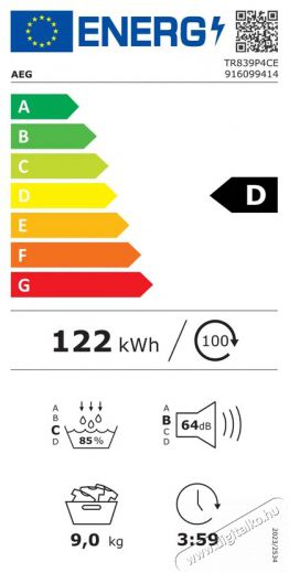 A kiváló AEG szárítógép energetikai adataiA szárítógép nagy mennyiségű, gyorsan és hatékonyan szárítandó ruhákhoz alkalmas, így praktikus megoldást jelent a gyermekes családok vagy a kevés idővel rendelkezők számára. Az energiafogyasztás alakulása éves szinten 0,03 kWh/év. A készülék töltetkapacitását illetően 9 kg ruha szárítására alkalmas. Zajszintje 64 dB. A szárítási hatékonyság az a tényező, amely megmutatja, hogy a ruhák milyen hatékonyan és gyorsan száradnak a szárítógépben. A hatékony AEG szárítógép B hatékonysági osztályba sorolható, így a normál szárítási mód a nedvesség több mint 80 - 89,9%-át képes eltávolítani a ruhákból.