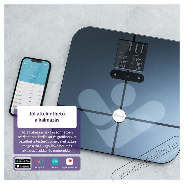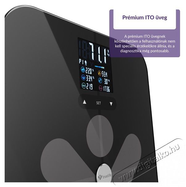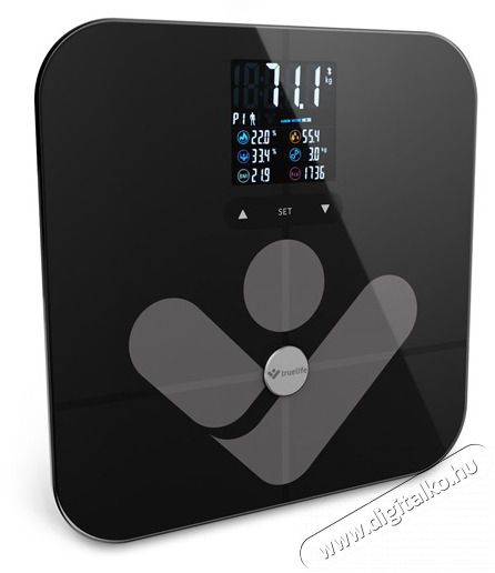 Kövesse részletesen figyelemmel a testét USP: Bioelektromos impedancia bluetooth mérleg ITO üveggel és 19 mérhető testindexszel. Egészséges életmódját akkor tudja a legjobban támogatni, ha tökéletesen megérti a testét. A TrueLife FitScale W7 BT intelligens mérleg segíthet ebben. A súlymérés mellett bioelektromos impedanciaelemzés alapú diagnosztikát is végez, 19 mérhető indexet számol ki, ezek közül 7-et az alkalmazás nélkül is. A felhasználó az eredményeket tiszta, színes LCD-kijelzőn láttja. A mérleget Bluetooth segítségével csatlakoztathatja mobiltelefonjához, és ha letölti az alkalmazást, még részletesebb képet kap arról, hogy mi történik a testével. A mérleg akár 180 kg teherbírású tartós, edzett ITO-üvegből készült.