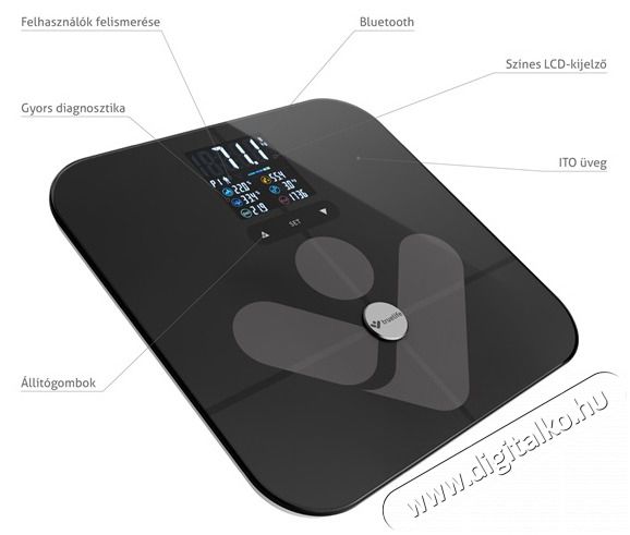 - Színes LCD-kijelző A mért értékek az áttekinthető színes LCD-kijelzőn láthatók, ugyanitt választhat a súly mértékegységek között.