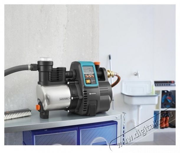 A kompakt GARDENA Premium 6000/6E LCD Inox háztartási automata szivattyú rozsdamentes nemesacél szivattyúházzal, 1300 W névleges teljesítménnyel, maximum 6000 l/h szállítási teljesítménnyel és 5,5 bar maximális nyomással mobil és fix használatra egyaránt kiválóan alkalmas, ahol csak szükség van rá.