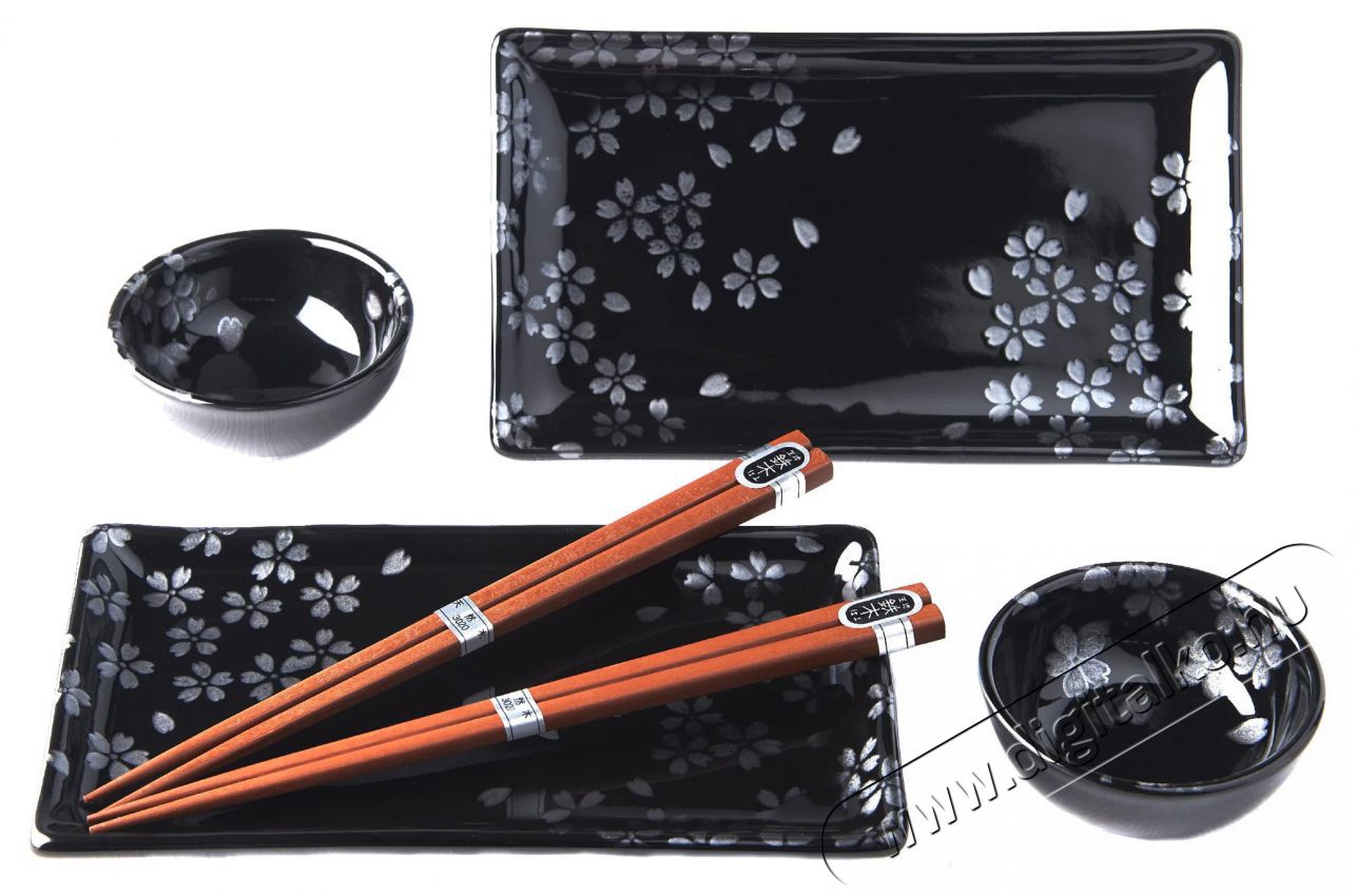 Made In Japan Sushi set Black Sakura 6 dbA Made in Japan tálak készletét japán mesterek készítették, akiknek hagyománya a 12. századra nyúlik vissza. A tartós, természetes minőségű kerámia  nem tartalmaz semmilyen egészségre káros anyagokat vagy nehézfémeket. A Black Sakura fekete színű, kézzel festett, virág motívummal díszített Sushi szett tartalma két pálcika, két Sushitányér, és két tálka a szójamártáshoz.  Az elegáns ajándékdoboznak köszönhetően a tálkészlet ajándéknak is megfelel a szeretteid vagy üzleti partnereid számára. Biztos lehetsz benne, hogy tetszeni fog az egyedisége, csúcsminőségű kialakítása és a hosszú élettartama.