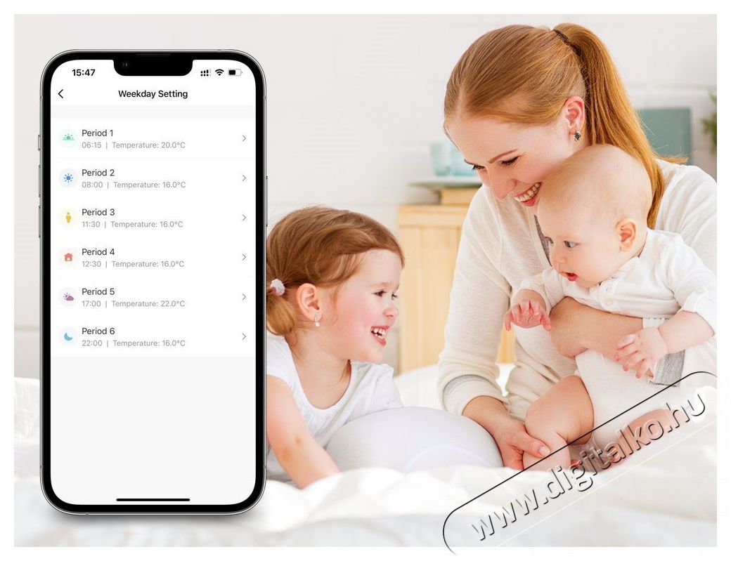 Az AVATTO WT498 egyszerű érintőképernyővel és átlátható kijelzővel rendelkezik. A termosztátot a háztartás minden tagja kényelmesen szabályozhatja. Természetesen egy egyértelmű mobilalkalmazás is rendelkezésre áll, amely megkönnyíti a fűtés beállítását bárhol és bármikor.