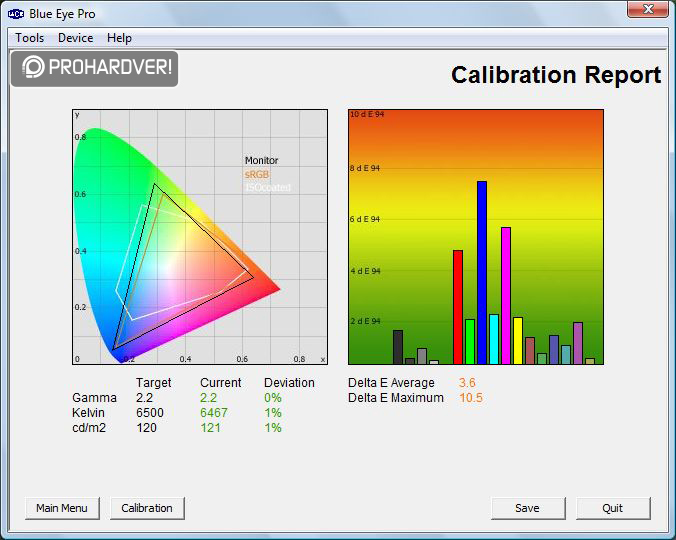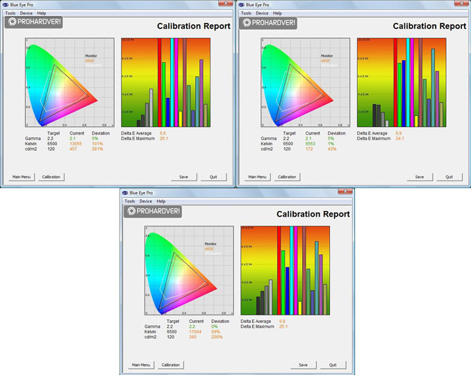 Egy kalibrátorral, illetve a LaCie Blue Eye Pro névre hallgató alkalmazás segítségével vettük szemügyre tüzetesebben az előzetes beállításokat. Ezek sorrendben: Dinamikus, Mozi, Normál. A kép jobb oldalán látható, hogy a bemért 18 szín milyen mértékben tér el a referenciától. Ennek meghatározására használatos a DeltaE, ami egy olyan numerikus érték, amely két különböző szín távolságát határozza meg egy színrendszeren belül. Minél kisebb a DeltaE értéke egy adott színnél, annál közelebb áll a referenciához, vagyis annál jobb.