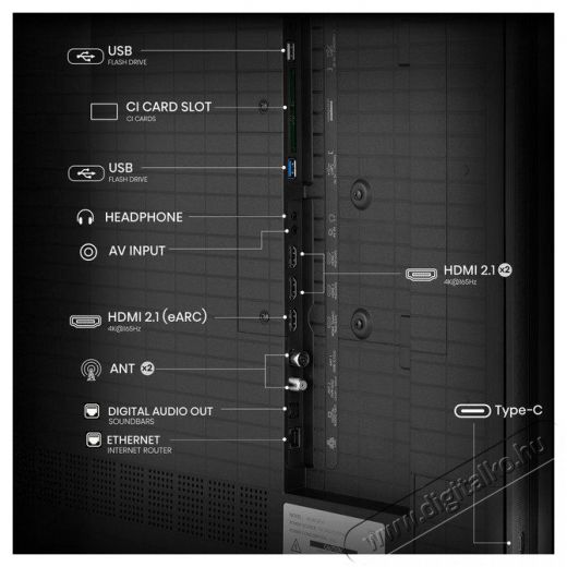 | Be- és kimenetek | CI+, HDMI 2.1, Kompozit, LAN, USB |