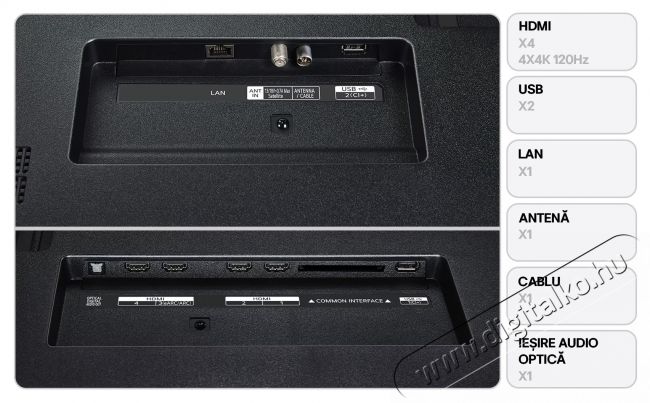 | Interfész | 2 x USB 1 x RJ-45 CI+ slot 1 x Digital Optical Out 4 x HDMI 2.1 |