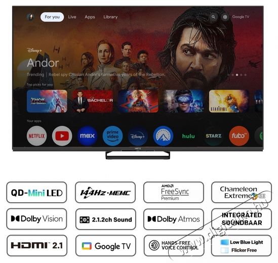*Előfordulhat, hogy egyes alkalmazások, tartalmak és/vagy funkciók nem minden országban érhetők el. Az elérhetőség eltérő lehet.*A Google TV a készülék szoftverélményének neve, és a Google LLC védjegye.