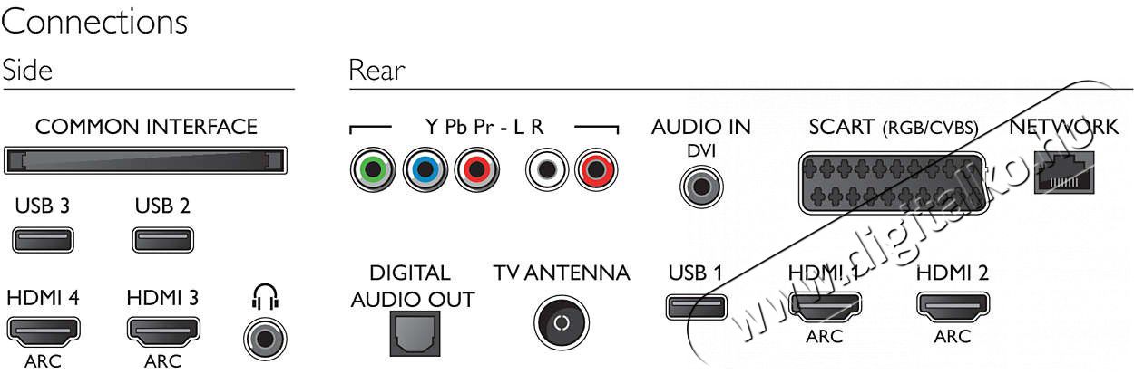 Csatlakozók | HDMI, Komponens csatlakozó, Scart csatlakozó, 3 x USB, CI modulfogadó, Ethernet csatlakozó, Digitális optikai audio kimenet, Sztereó audio bemenet, DVI bemenet, Fejhallgató kimenet |