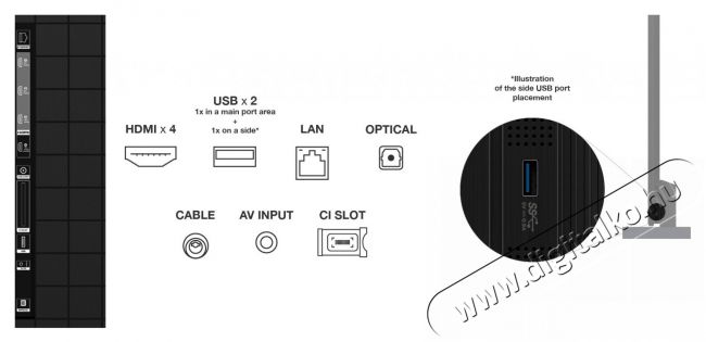 | Interfész | USB 3.0 1 x RJ-45 CI+ slot 1 x HDCP 2.2 1 x Digital Optical Out 4 x HDMI 2.1 |