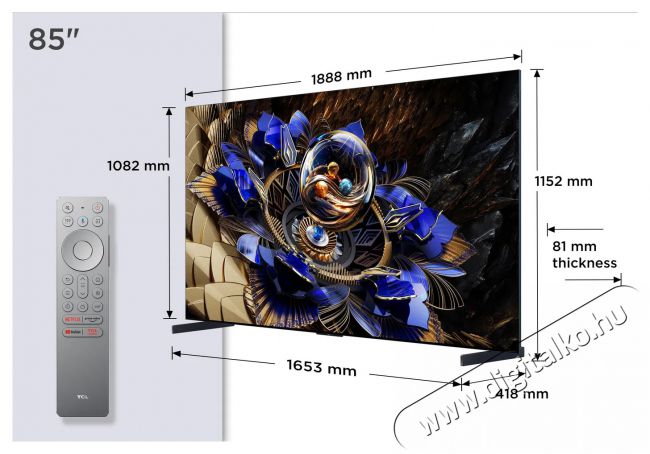 Kivételesen éles képi megjelenítésÉlvezd a részletes 4K Ultra HD felbontást 85" képátló mellett. Ez a lenyűgöző TCL tévé köszönhetően annak, hogy nagy számban helyeztek el pixeleket a képernyő egész területén, rendkívül éles kép megjelenítésére képes. A 4K jelölés azt jelenti, hogy négyszer annyi pixelt kapott, mint a standard Full HD képernyő. A kép 3840 × 2160 képpontból áll, amely garantálja a rendkívüli élességet. A Mini LED technológia, a jobb fényerő és kontraszt érdekében, több száz vagy akár több ezer zónára van felosztva. A helyi fényerő szabályozás-funkció gondoskodik a háttérvilágításról a sötét helyeken. A local diming olyan természetesen mérsékli a fényerőt, hogy a világos részek minősége sem romlik. A kijelző felületét tükröződésmentes bevonattal látták el, amely megakadályozza a környezeti fény visszatükröződését. Nincs funkcióval látták el, melynek hála nézhetünk olyan filmeket is, amelyen háromdimenziós élményt nyújtanak.