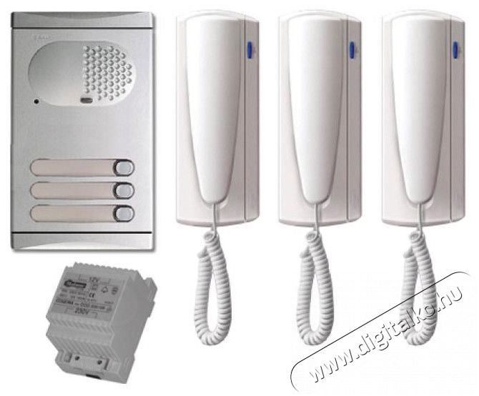 Háromlakásos audio kaputelefon szett, mely tartalmaz mindent, ami a kaputelefon felszereléséhez szükséges. Moduláris felépítésű, ezért bármikor egyszerűen kiegészíthető, bővíthető például nagyobb lakásszámúra, kódzáras ajtónyitásra. Az erős, alumínium szerkezetű kültériegység a szükséges kiegészítőkkel falonkívül, süllyesztve és esővédővel is elhelyezhető. A nyomógombok mellett megvilágított névtáblával rendelkezik. Az esztétikus lakáskészülékekhez még két kiegészítő lakáskészüléket csatlakoztathat párhuzamosan mindegyik lakásban, melyekről gombnyomással kaput is nyithatnak